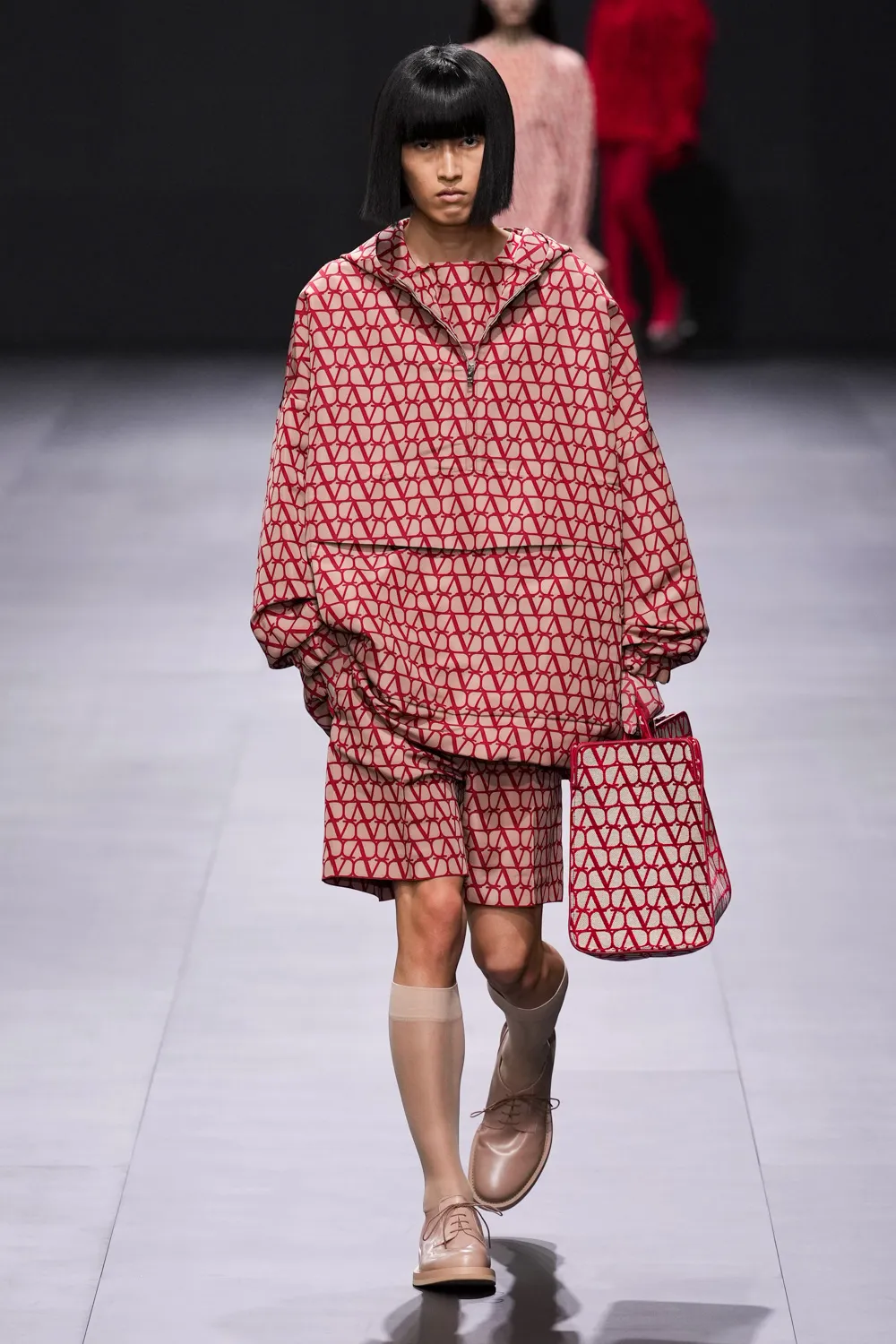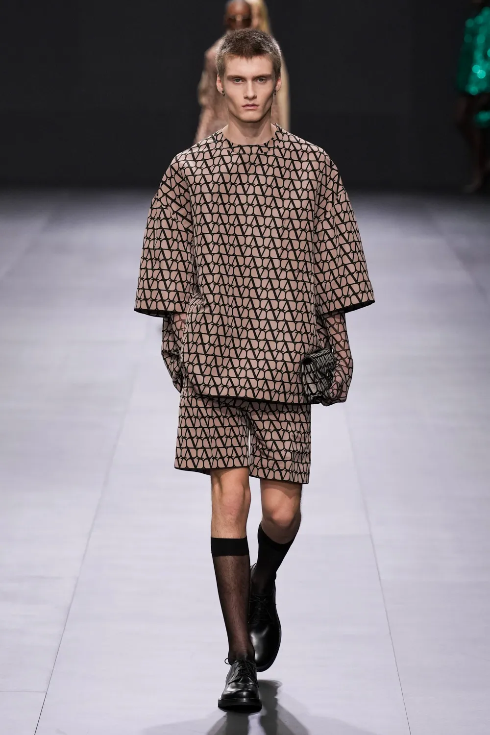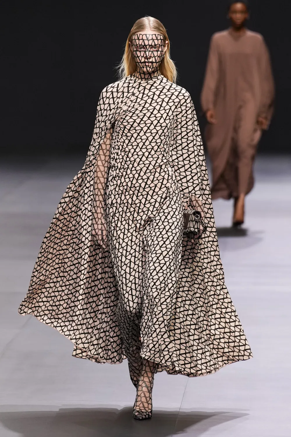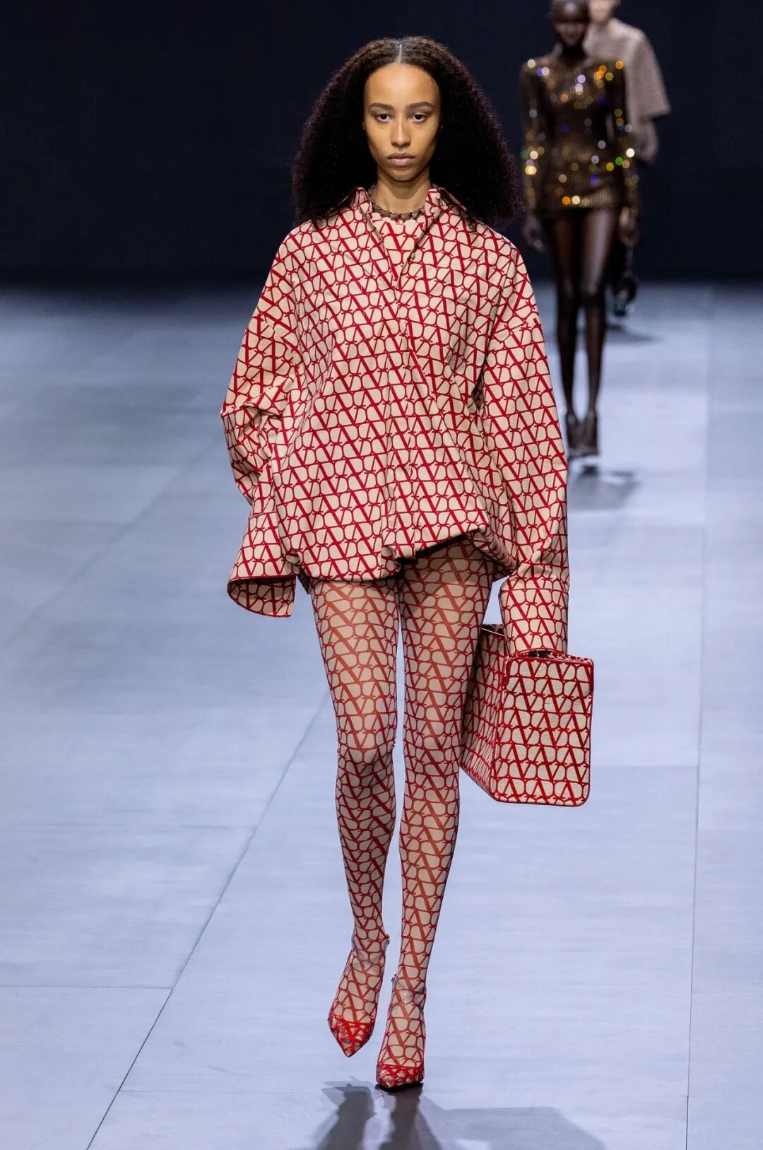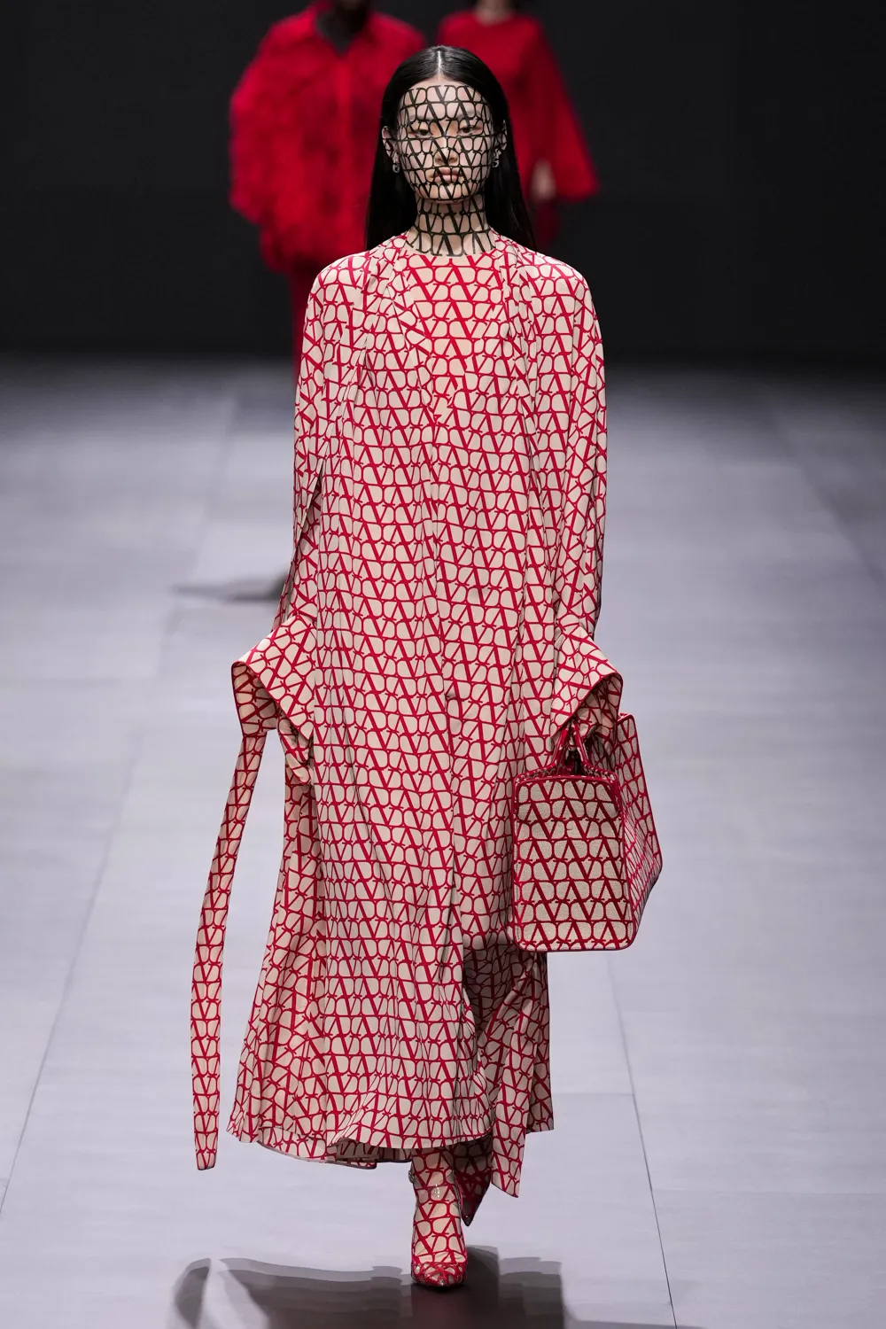 这个图案从服装一直延伸到模特的身体,暴露在外的部分皆装点上了VLOGO SIGNATURE。简单的线条图案平铺并不意图给人强烈的流行冲击力,而是克制幽默的先锋表达:当符号被堆叠成迷宫图案,自身也成为了一种风格。在单一和多重直白的变幻重叠中,Valentino完成了一次令人印象深刻的戏仿。