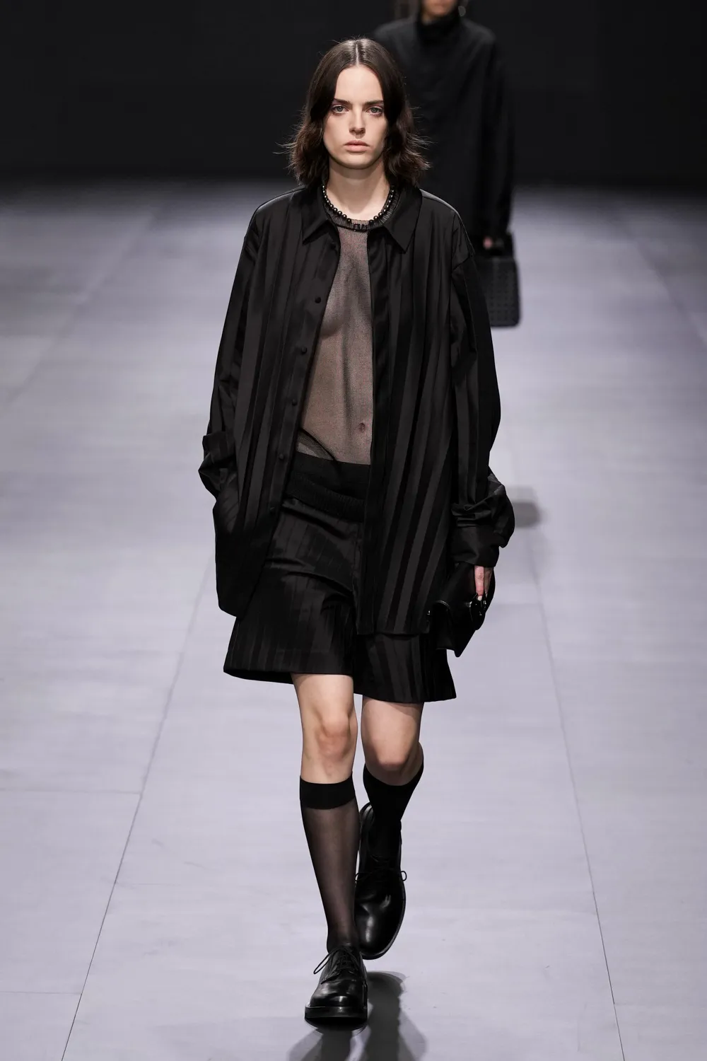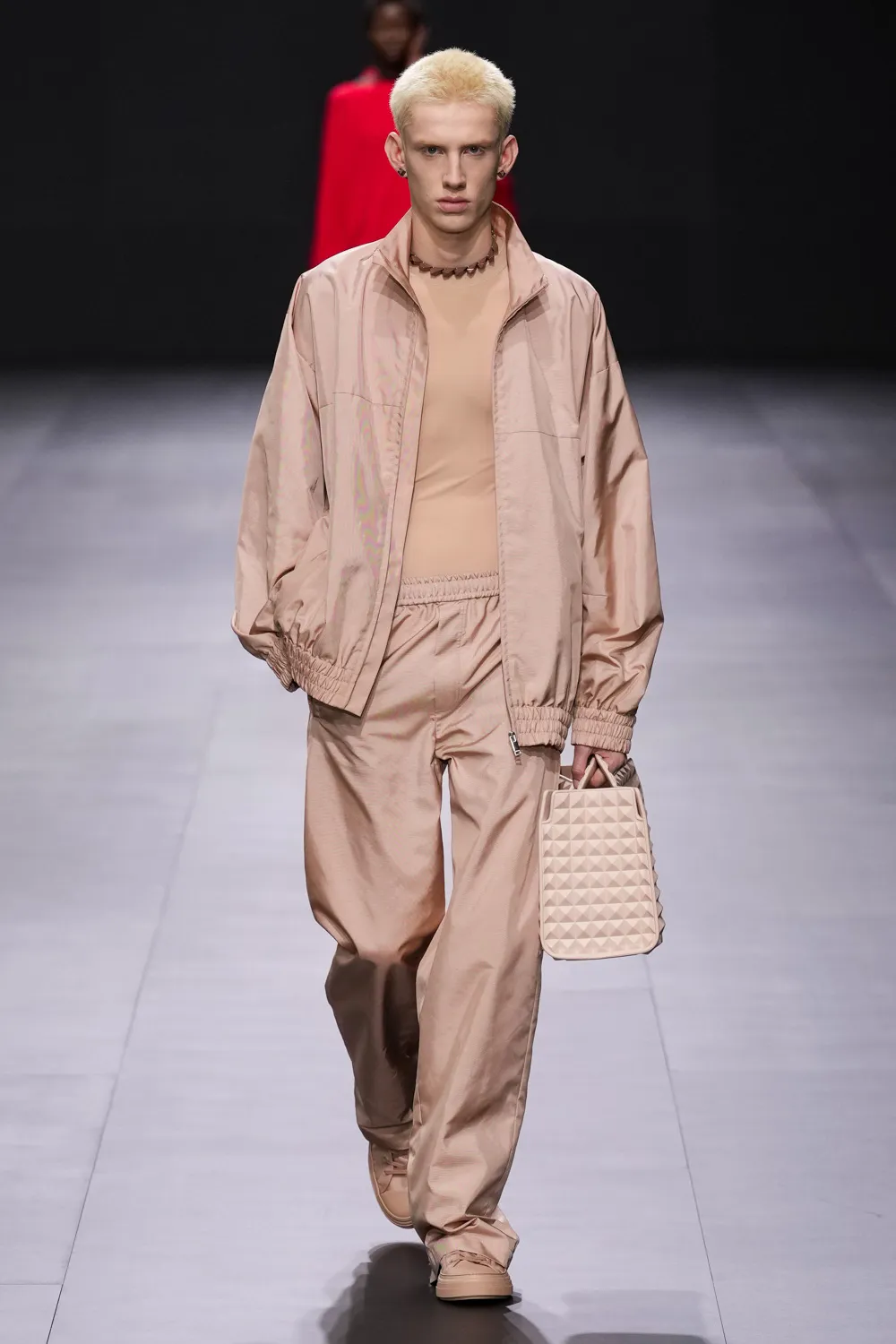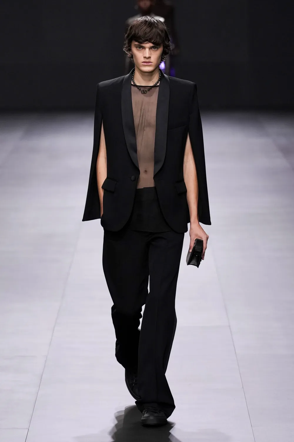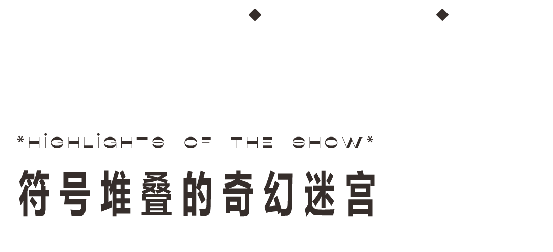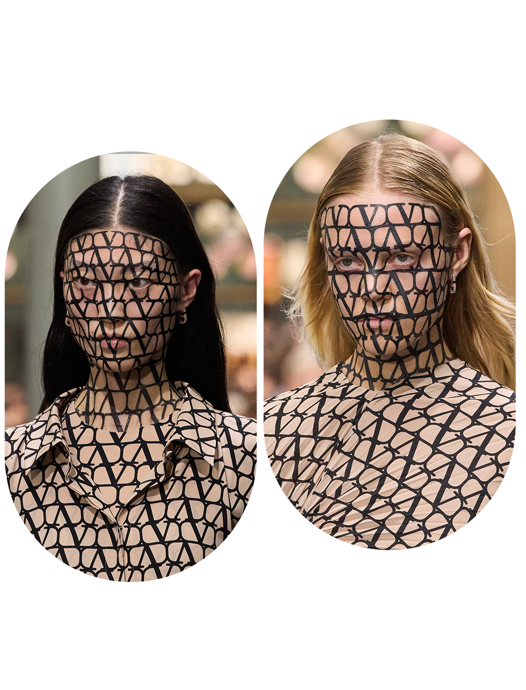 这个图案从服装一直延伸到模特的身体,暴露在外的部分皆装点上了VLOGO SIGNATURE。简单的线条图案平铺并不意图给人强烈的流行冲击力,而是克制幽默的先锋表达:当符号被堆叠成迷宫图案,自身也成为了一种风格。在单一和多重直白的变幻重叠中,Valentino完成了一次令人印象深刻的戏仿。