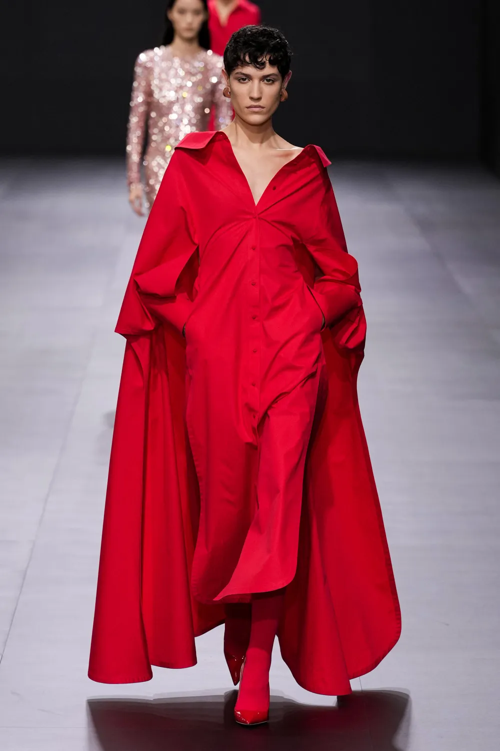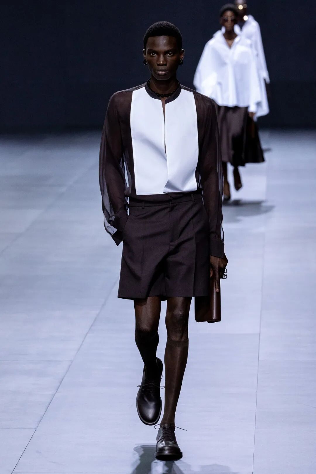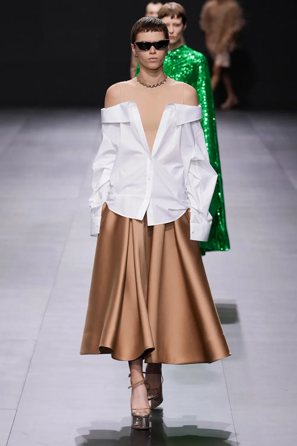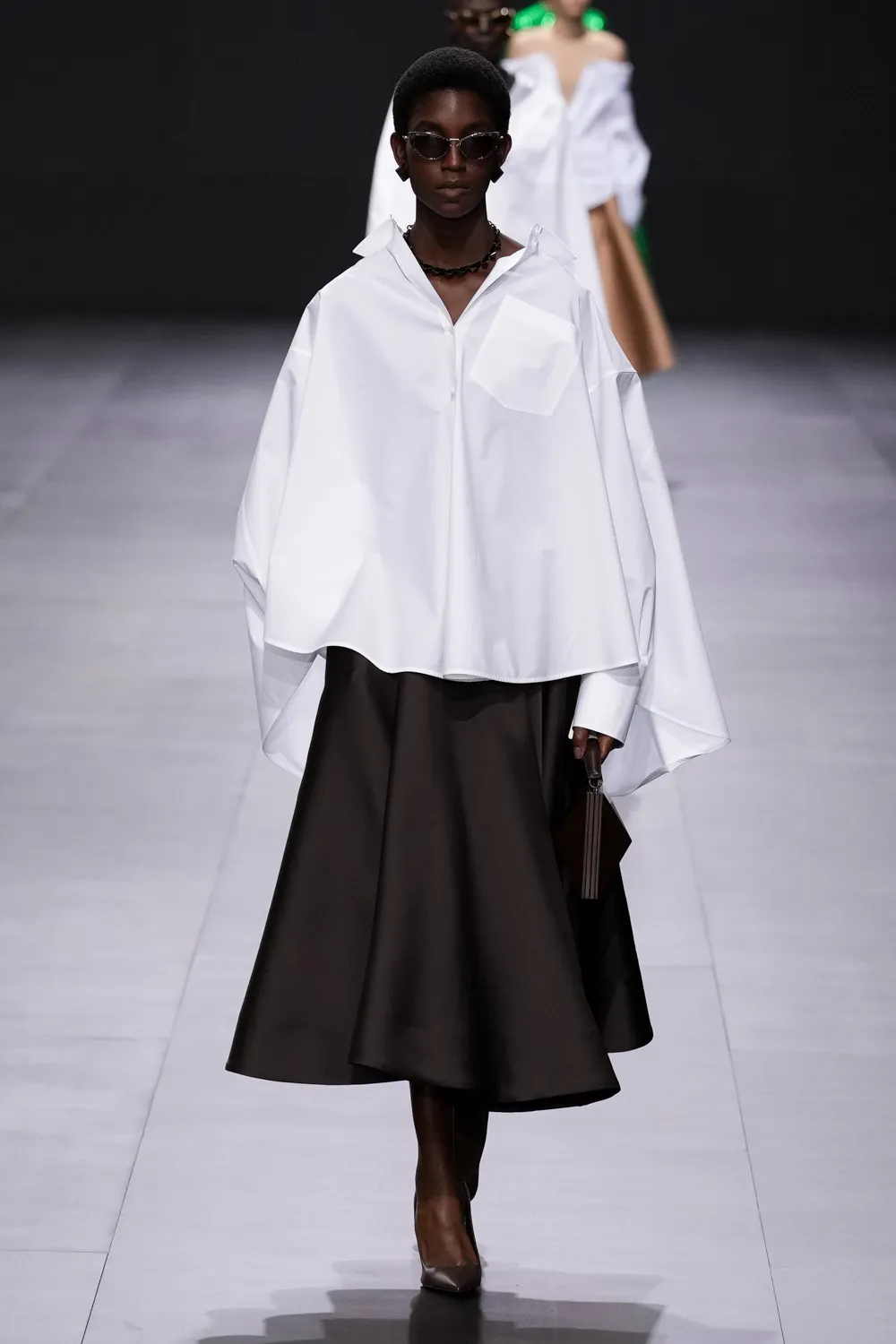 “纯粹”是本季的重要主题。在时装设计中,被舍离的部分在创作过程中往往至关重要,因为它反而能直指核心,通向本质。如何化繁为简,在留白中呈现繁复精巧的高定精神,是Valentino在本季意图回答的。 叠化和重构是Valentino交出的特别答卷。往往被视为最基础单品的白衬衫,便有如最“纯粹”的白纸,在本季被拆解,加之以打褶、灯笼收口、加长比例等手法转而变为露肩上衣、连衣裙,披风的形态亦幻化其中,让日常单品在保持本身极简特性的同时,呈现出精妙的构造。叠层设计化于无形,将繁复元素以“纯粹”的形式呈现,反衬出高定设计本质的复杂与丰沛。本季设计师将多种服装形态以极简形式加以叠化,如鱼尾裙摆叠加于长西服外套、衬衫连体裤糅合礼服披风、衬衫与背心拼贴于蓬蓬礼服裙……用最简单的构造和线条呈现了丰富有趣的设计语言。