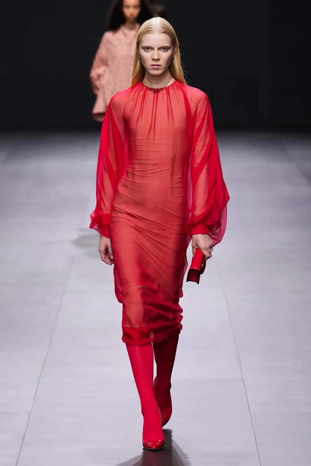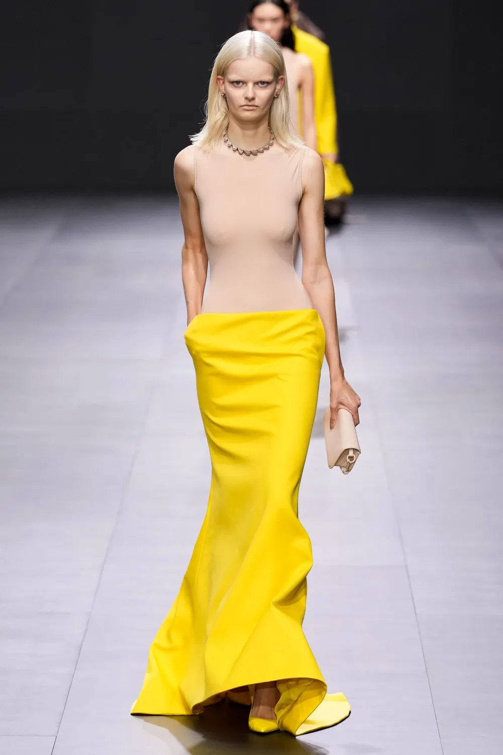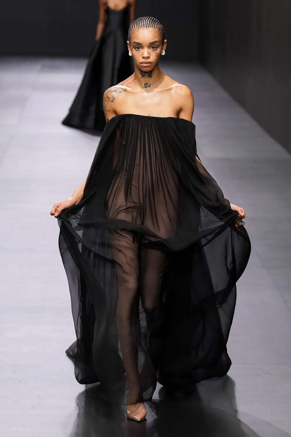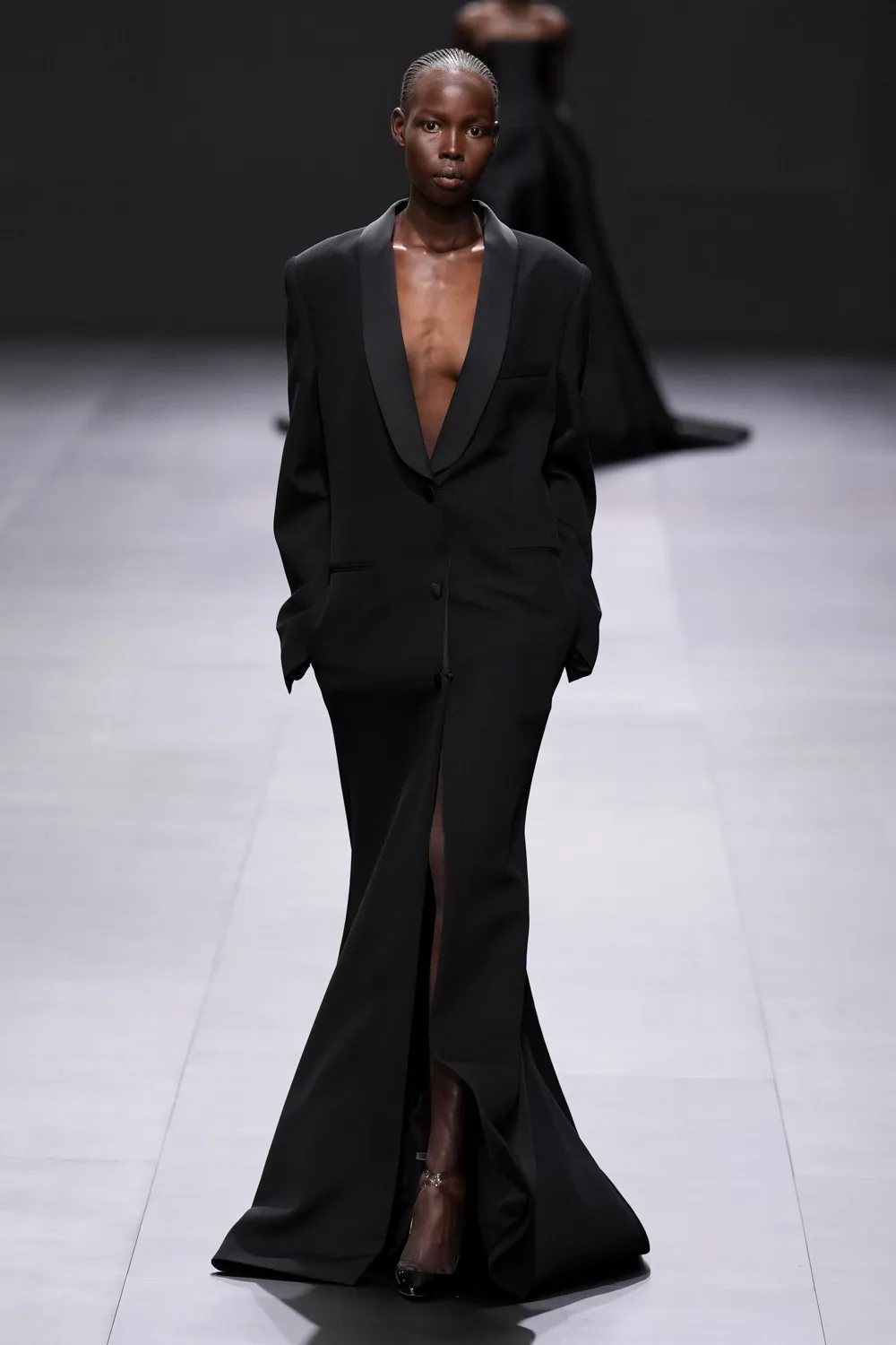 “纯粹”是本季的重要主题。在时装设计中,被舍离的部分在创作过程中往往至关重要,因为它反而能直指核心,通向本质。如何化繁为简,在留白中呈现繁复精巧的高定精神,是Valentino在本季意图回答的。 叠化和重构是Valentino交出的特别答卷。往往被视为最基础单品的白衬衫,便有如最“纯粹”的白纸,在本季被拆解,加之以打褶、灯笼收口、加长比例等手法转而变为露肩上衣、连衣裙,披风的形态亦幻化其中,让日常单品在保持本身极简特性的同时,呈现出精妙的构造。叠层设计化于无形,将繁复元素以“纯粹”的形式呈现,反衬出高定设计本质的复杂与丰沛。本季设计师将多种服装形态以极简形式加以叠化,如鱼尾裙摆叠加于长西服外套、衬衫连体裤糅合礼服披风、衬衫与背心拼贴于蓬蓬礼服裙……用最简单的构造和线条呈现了丰富有趣的设计语言。