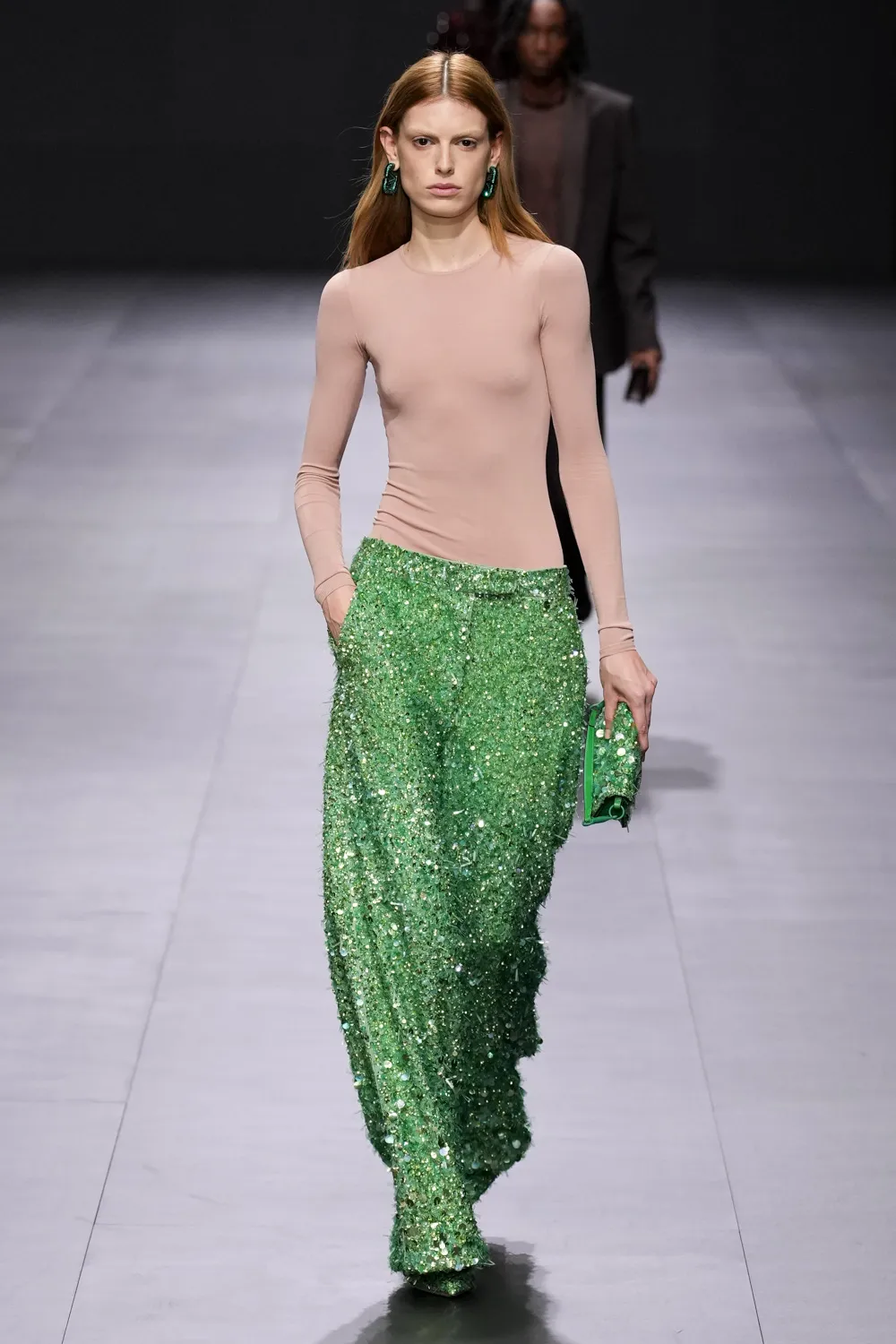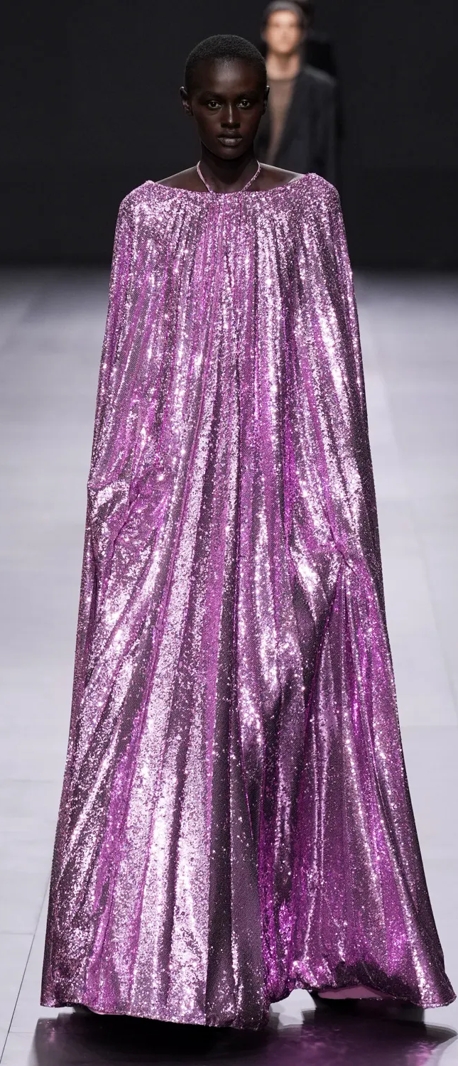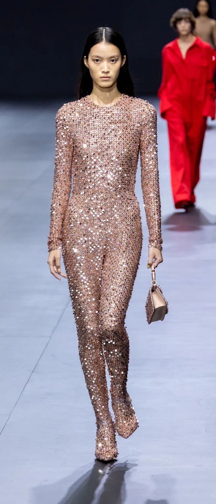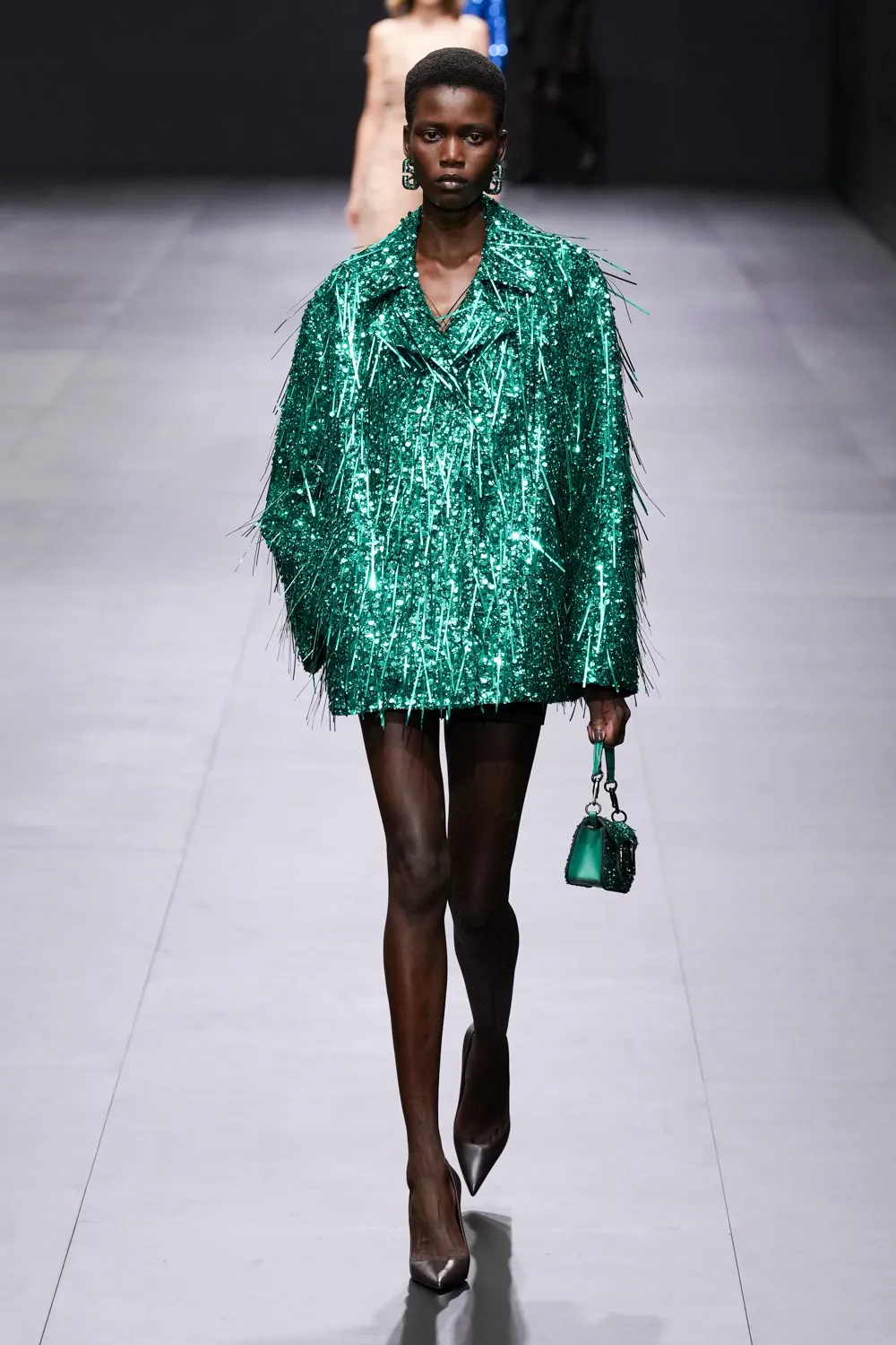 除了元素的拼贴运用,对功能的重新定义是高定礼服和日常着装相互打通的必经之路。当精巧胸衣进化成贴身背心,华丽夸张的礼服变成日常下装……优雅便超越了过去和未来、古典与现代,在极简与极繁中凸显了本质。 水晶、亮片、丝线等元素是本季令人难以忽视的“亮”点。将晚礼服的闪耀面料运用于外套和裙装,既是极简,也是极繁。如此直接而颇具戏剧性的设计语言,是Valentino的热烈张扬。