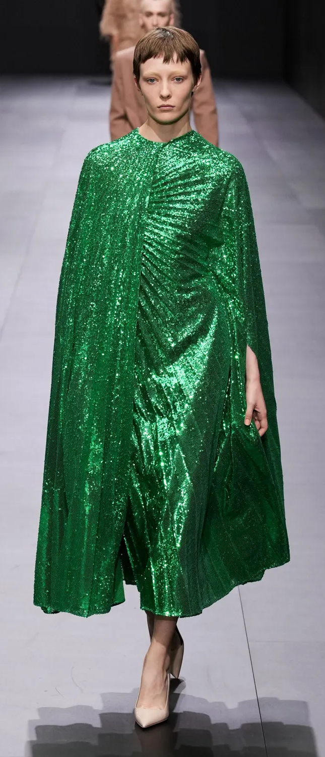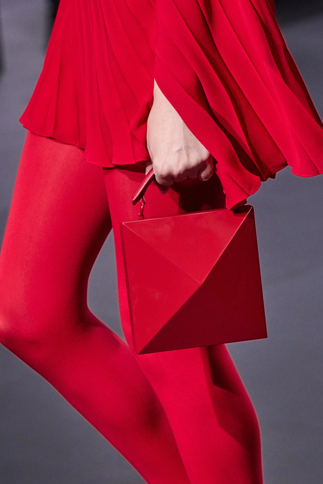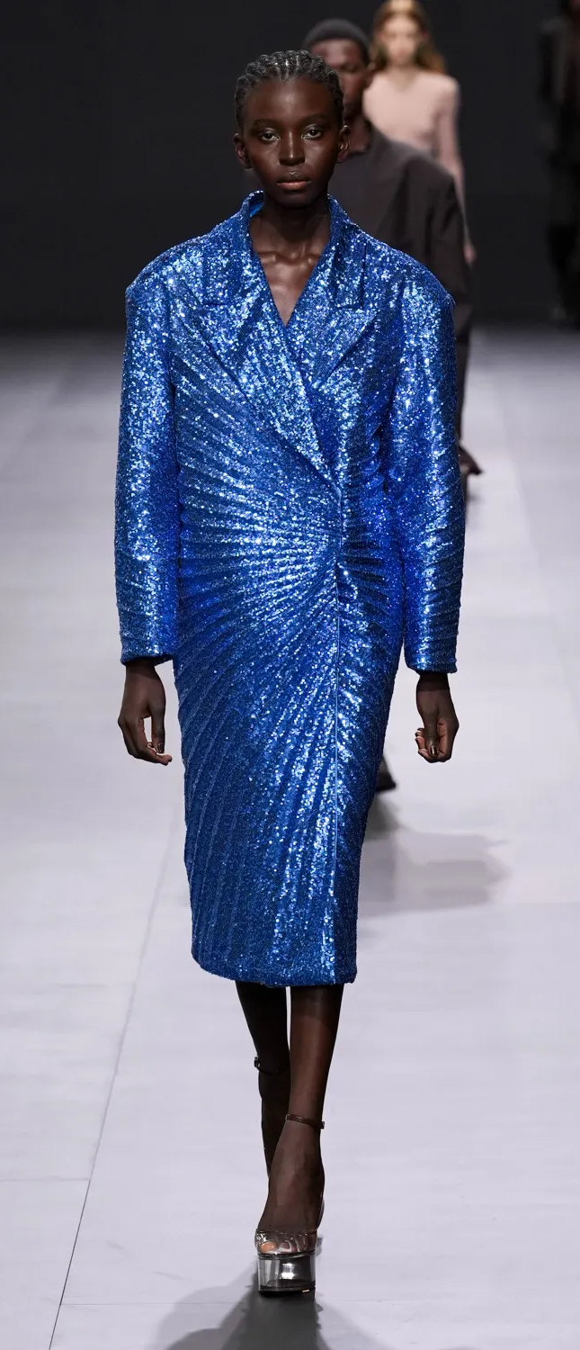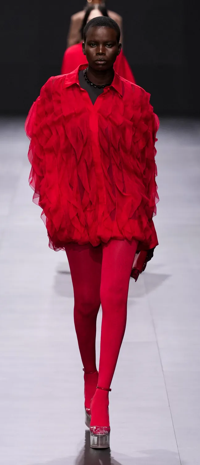 除了元素的拼贴运用,对功能的重新定义是高定礼服和日常着装相互打通的必经之路。当精巧胸衣进化成贴身背心,华丽夸张的礼服变成日常下装……优雅便超越了过去和未来、古典与现代,在极简与极繁中凸显了本质。 水晶、亮片、丝线等元素是本季令人难以忽视的“亮”点。将晚礼服的闪耀面料运用于外套和裙装,既是极简,也是极繁。如此直接而颇具戏剧性的设计语言,是Valentino的热烈张扬。