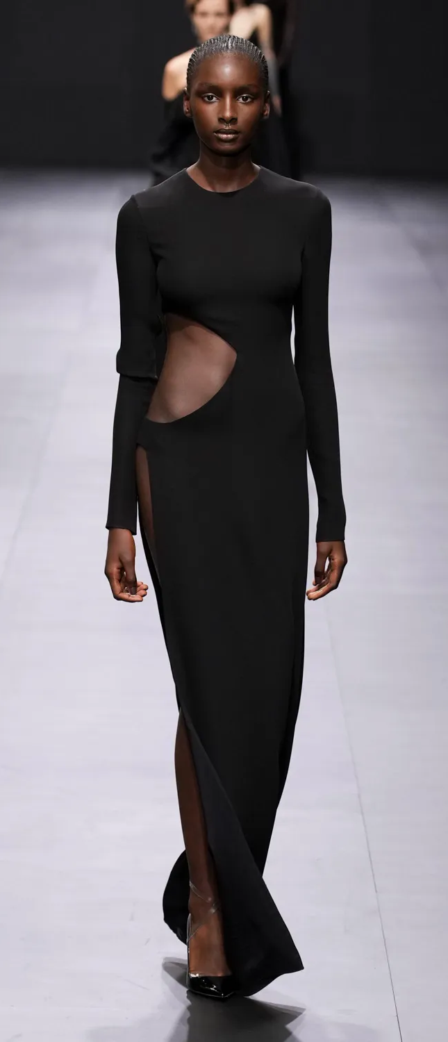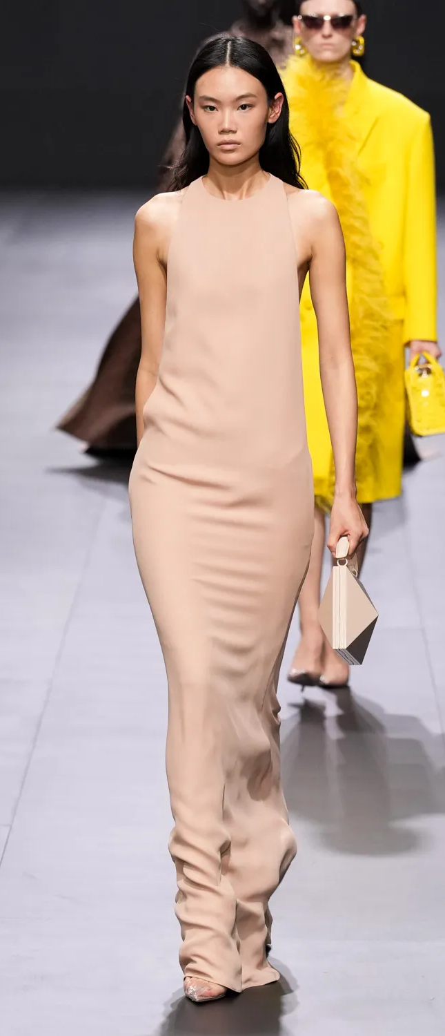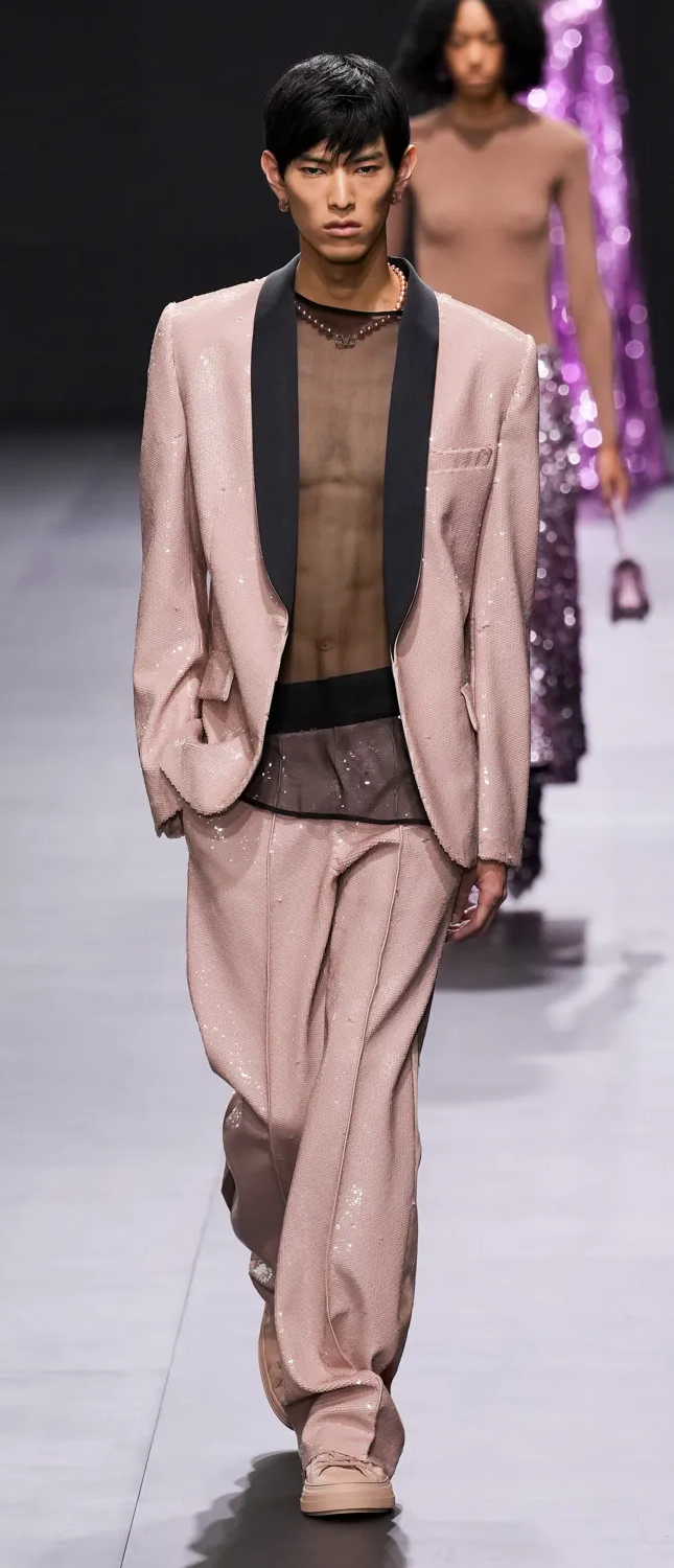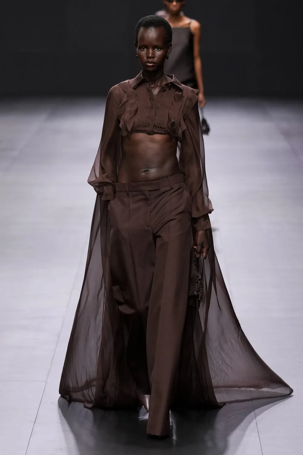 裸露与贴合:第二层皮肤 留白的存在并非由于缺乏内容,而是为了凸显个人选择。衣着的贴合剪裁与透明度能揭示穿着者的个性,也在身体美学的展示中让服装生成身份。 本季Valentino的贴身晚装,让衣物随着不同穿着者的身形与律动呈现不同曲线。裸色的面料更如同皮肤的温柔隐喻:时装不是为了遮蔽,而是为了显露我们的另一层自我。 透视的手法亦出现在裙装、背心等单品中。飘逸的褶皱薄纱颇具古典浪漫气质,当它与现代单品发生碰撞,亦带来了先锋奇幻的美感,也打通了性别、风格等预设的框架。 平铺手法让品牌经典VLOGO SIGNATURE在本季成为了“Valentino”式老花。简洁字母构成的几何形状平铺成印花,搭配沉稳色系,也有种古典的抽象美。尤其是在休闲套装上的运用,颇有几分“old money”之感。将如今奢侈品牌成衣设计中的常见手法以独有的风格呈现,是需要勇气和功底的。
