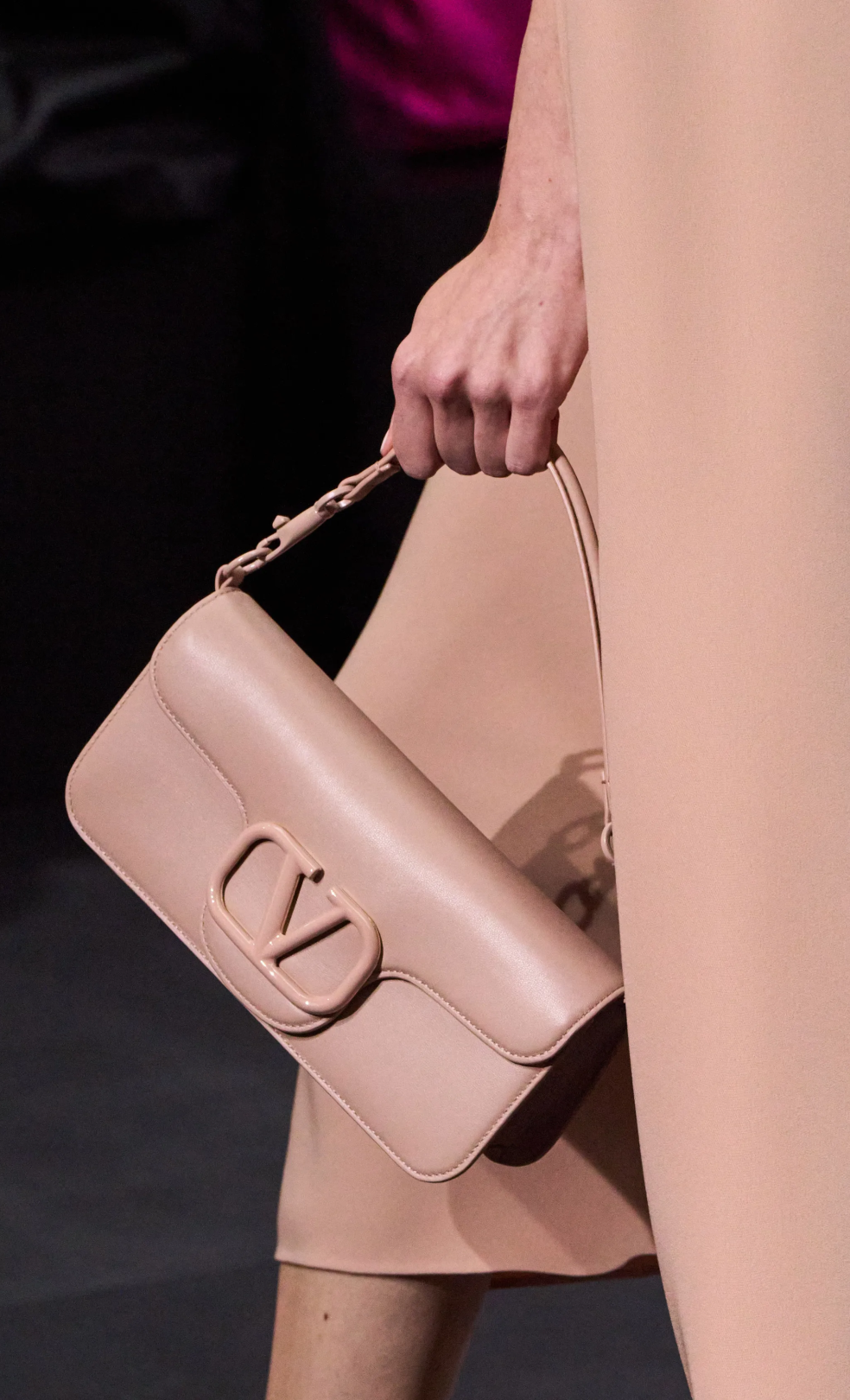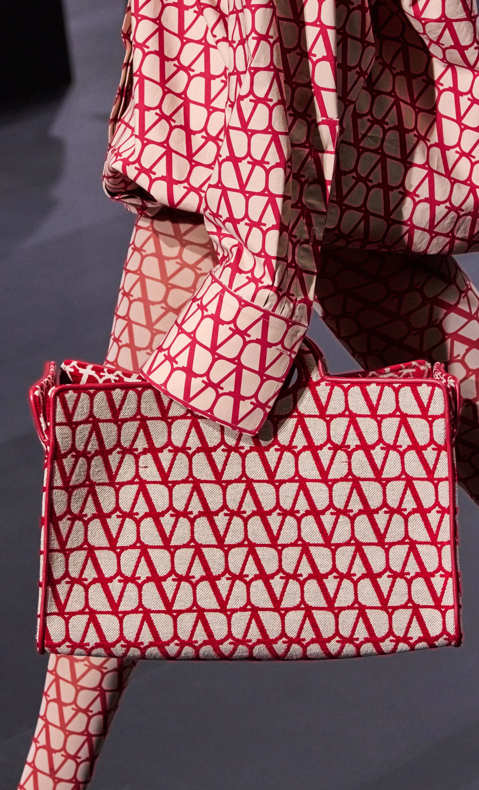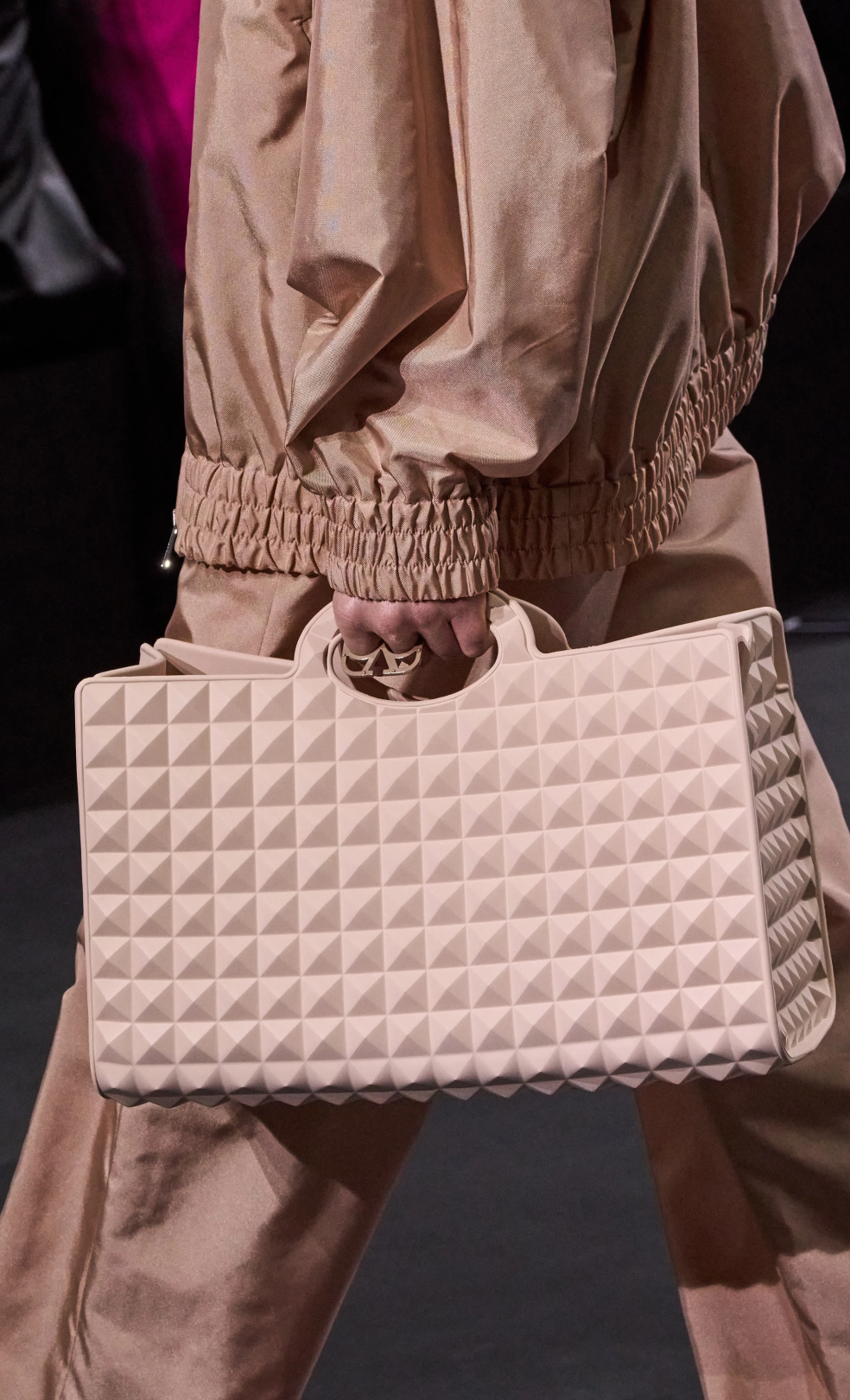 在LOC?手袋中运用的高定元素也在托特包中有所体现。夸张华美的元素与实用的日常包款形成巨大反差。 本季还出现了真?“ONE STUD”手袋。直接将Valentino的标志性STUD铆钉作为包身,正如设计理念所言的,这种极简反而凸显出了设计的真正意图:棱角分明的几何感,是不羁的浪漫精神在现代设计中的演化。
