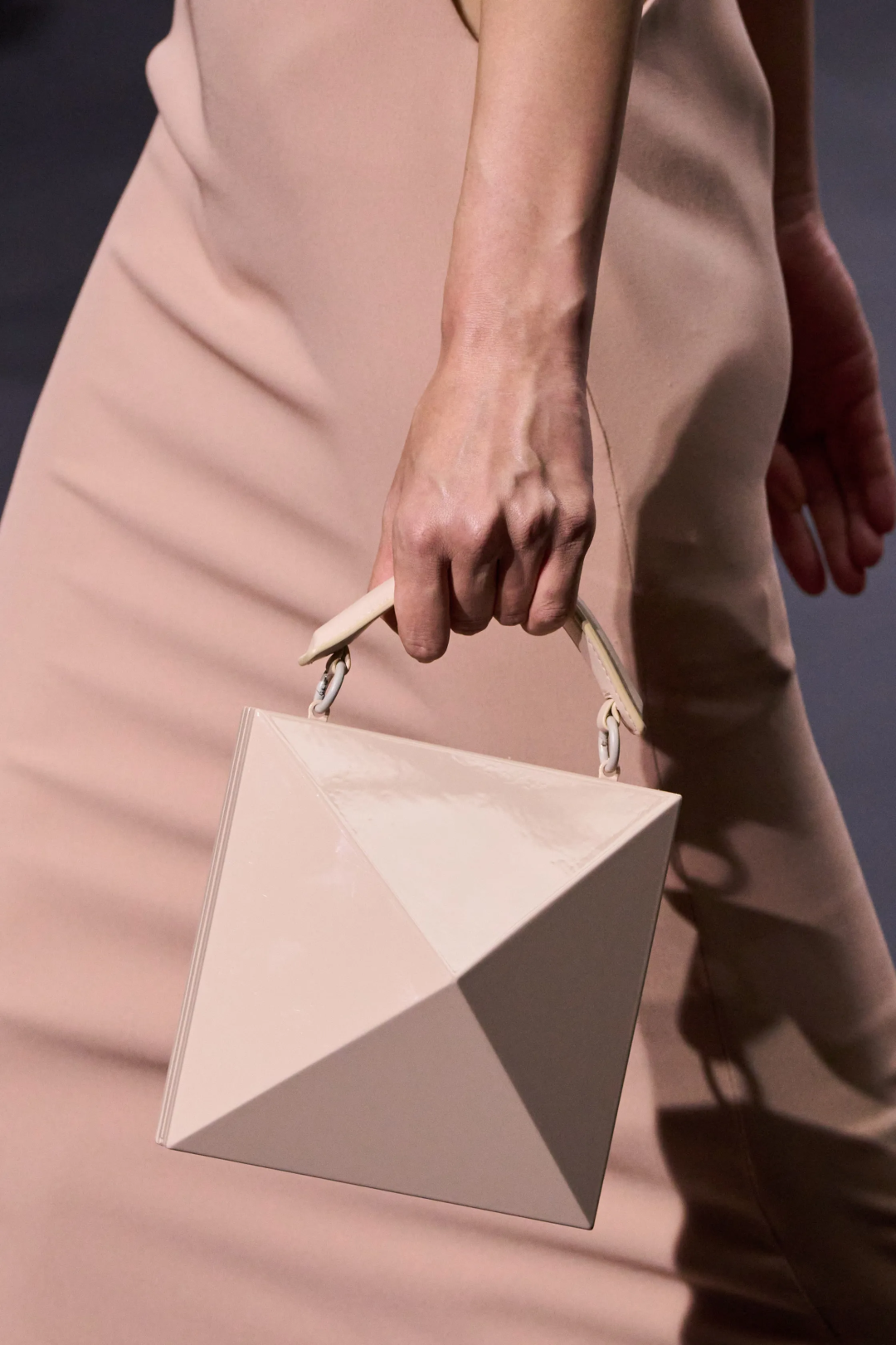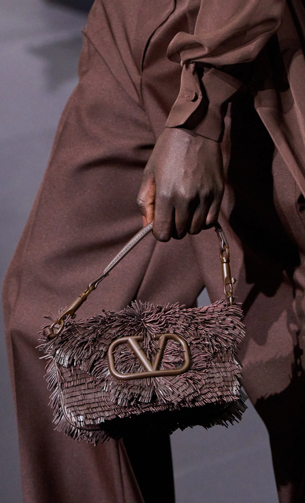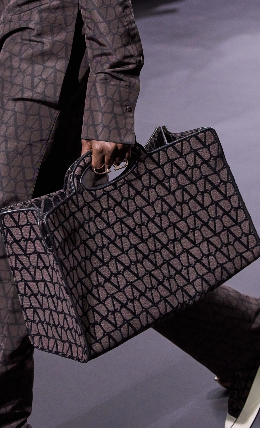 在LOC?手袋中运用的高定元素也在托特包中有所体现。夸张华美的元素与实用的日常包款形成巨大反差。 本季还出现了真?“ONE STUD”手袋。直接将Valentino的标志性STUD铆钉作为包身,正如设计理念所言的,这种极简反而凸显出了设计的真正意图:棱角分明的几何感,是不羁的浪漫精神在现代设计中的演化。