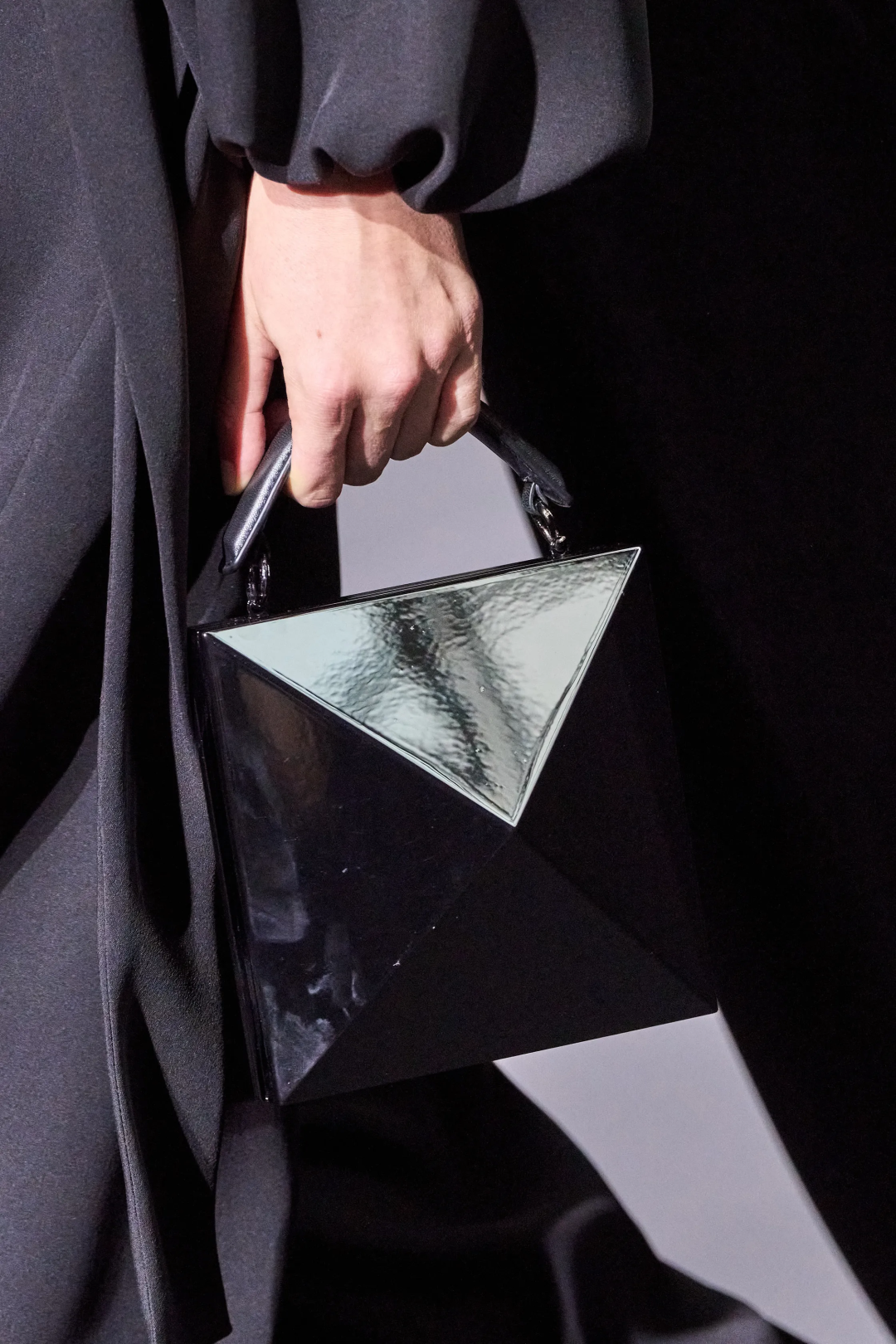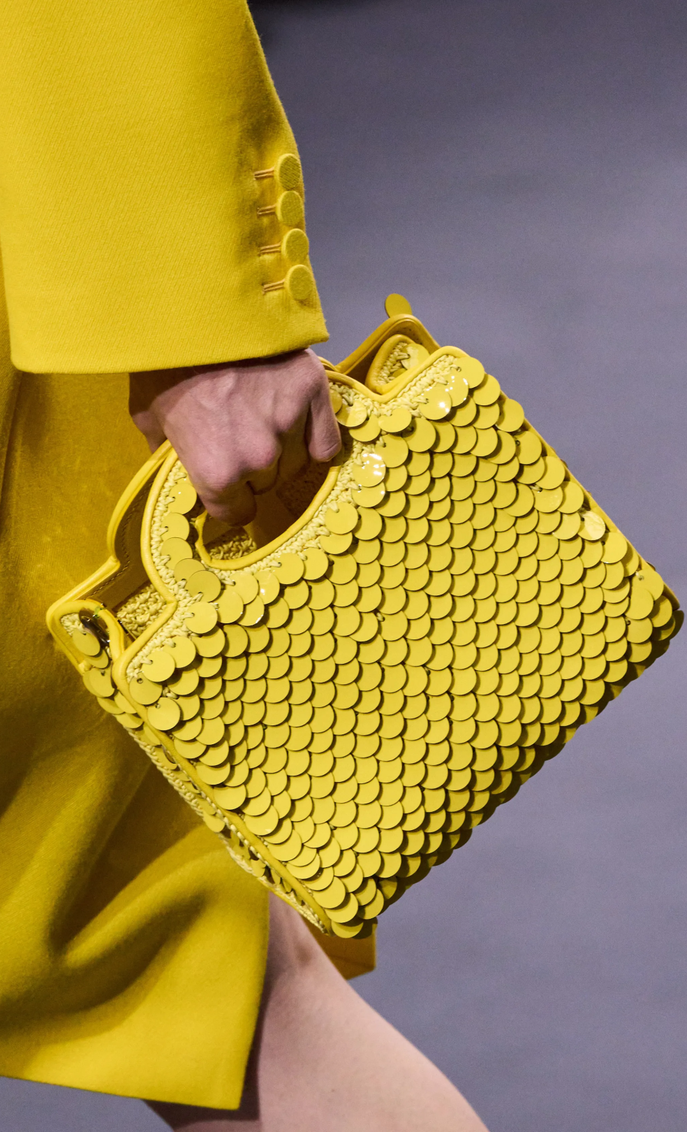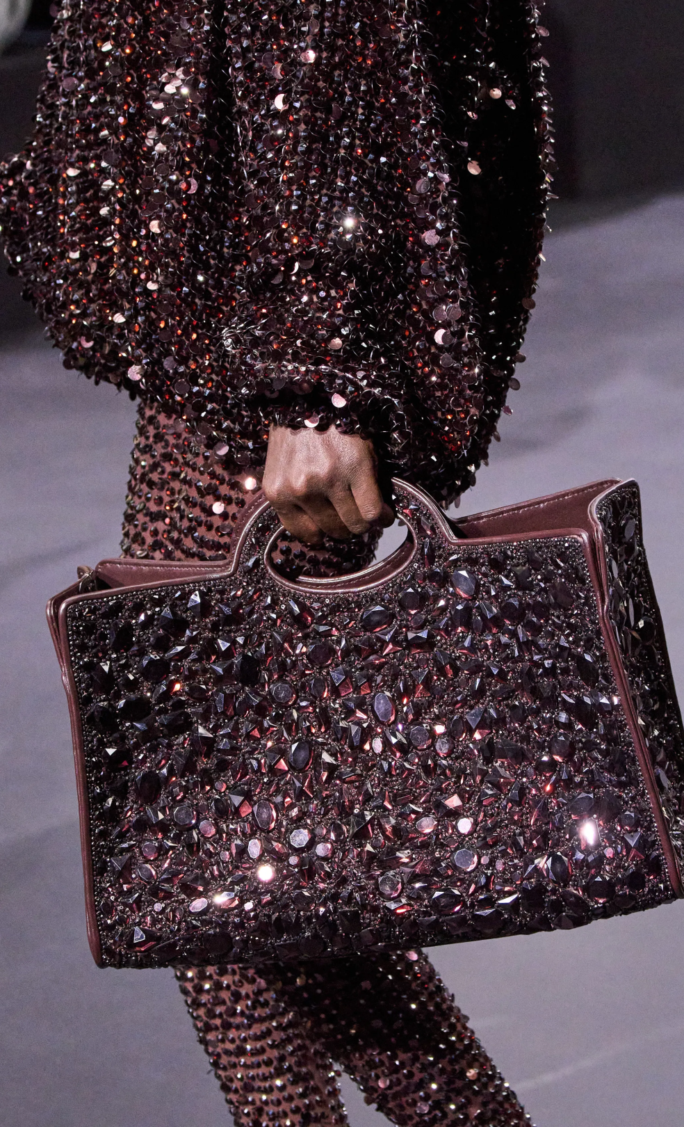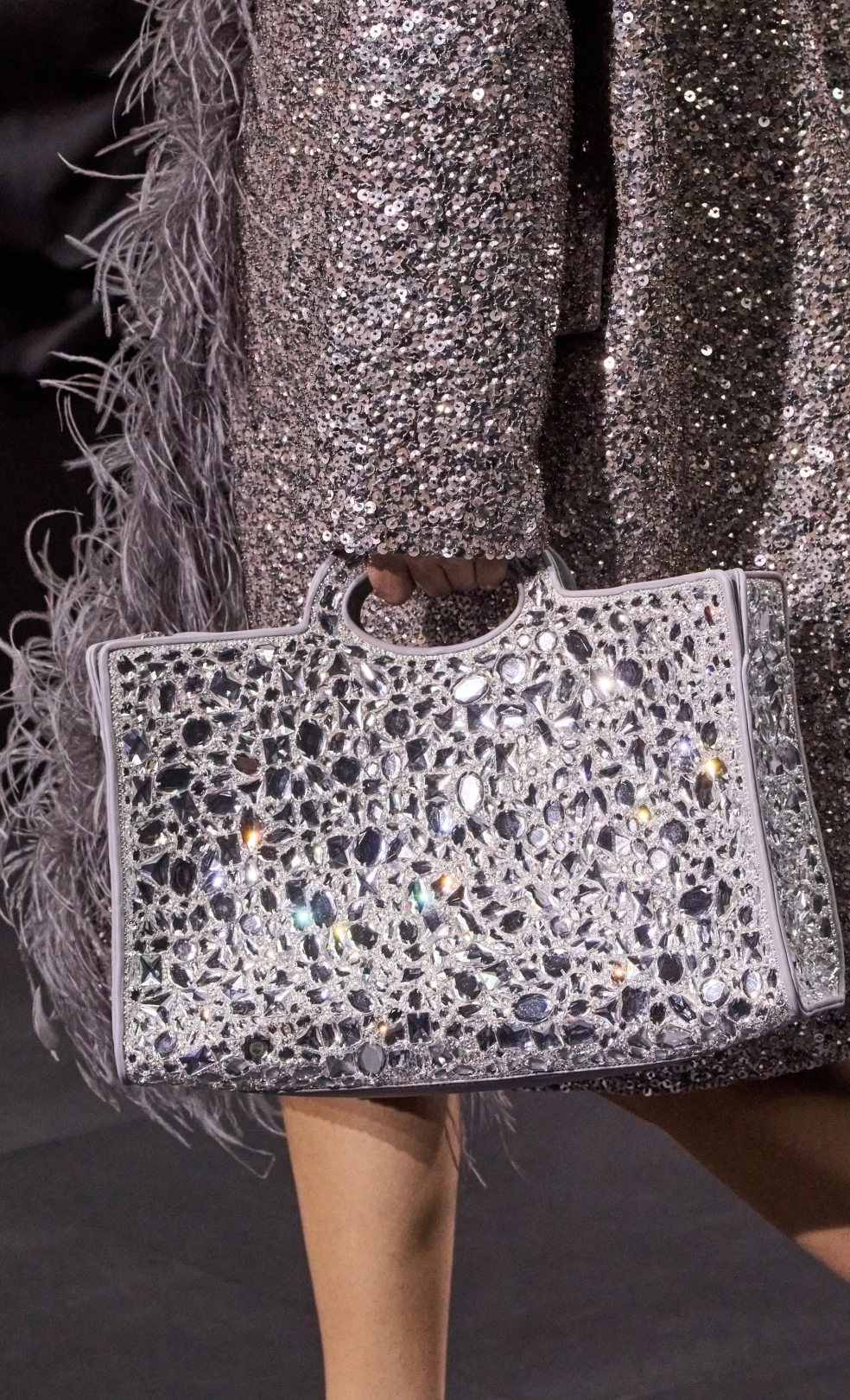 此次包袋的呈现亦贯彻了将高定思维融入日常时装的主题。经典的LOC?手袋除了以极具质感的皮质塑造优雅包身,还运用了成衣上出现的大量高定元素如亮片、碎钻等,让实用的日常包袋瞬间化身华美精巧的晚宴手拿包。