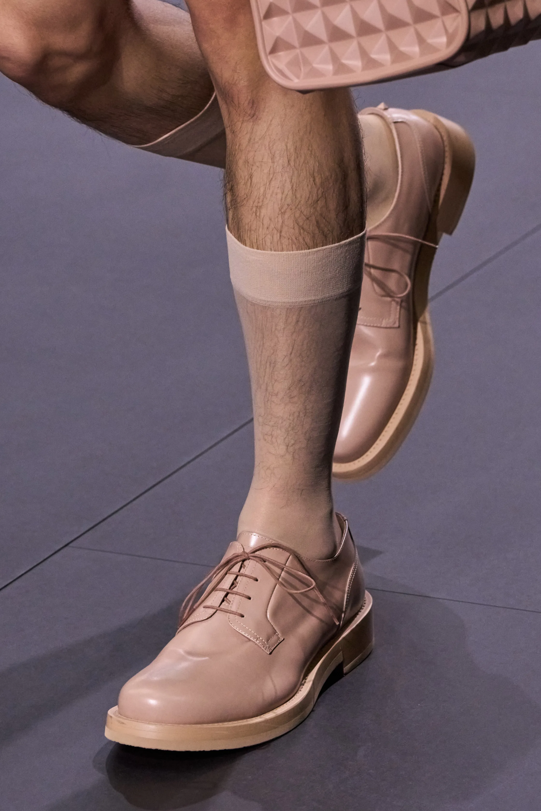 鞋履方面,本季以更为简洁的方式呈现了ROCKSTUD鞋款,将ROCKSTUD点缀于鞋后跟,柔美优雅的鞋身线条和它的锐利狂野相互中和。