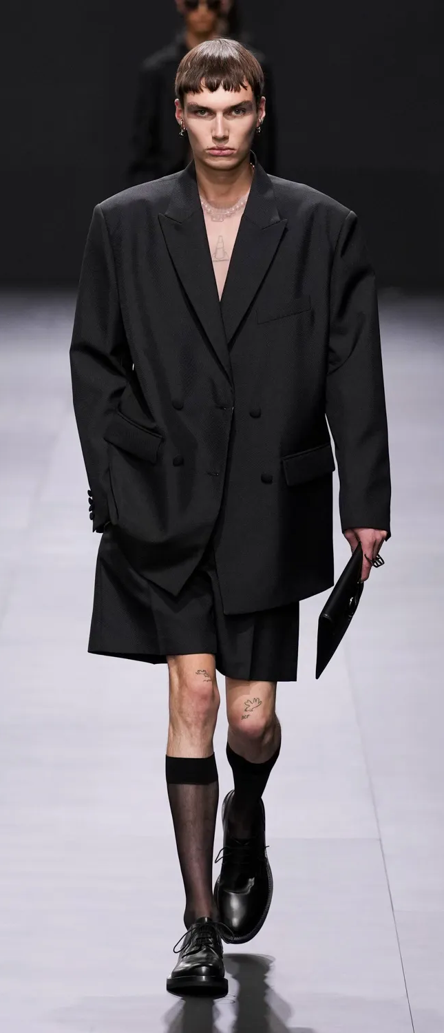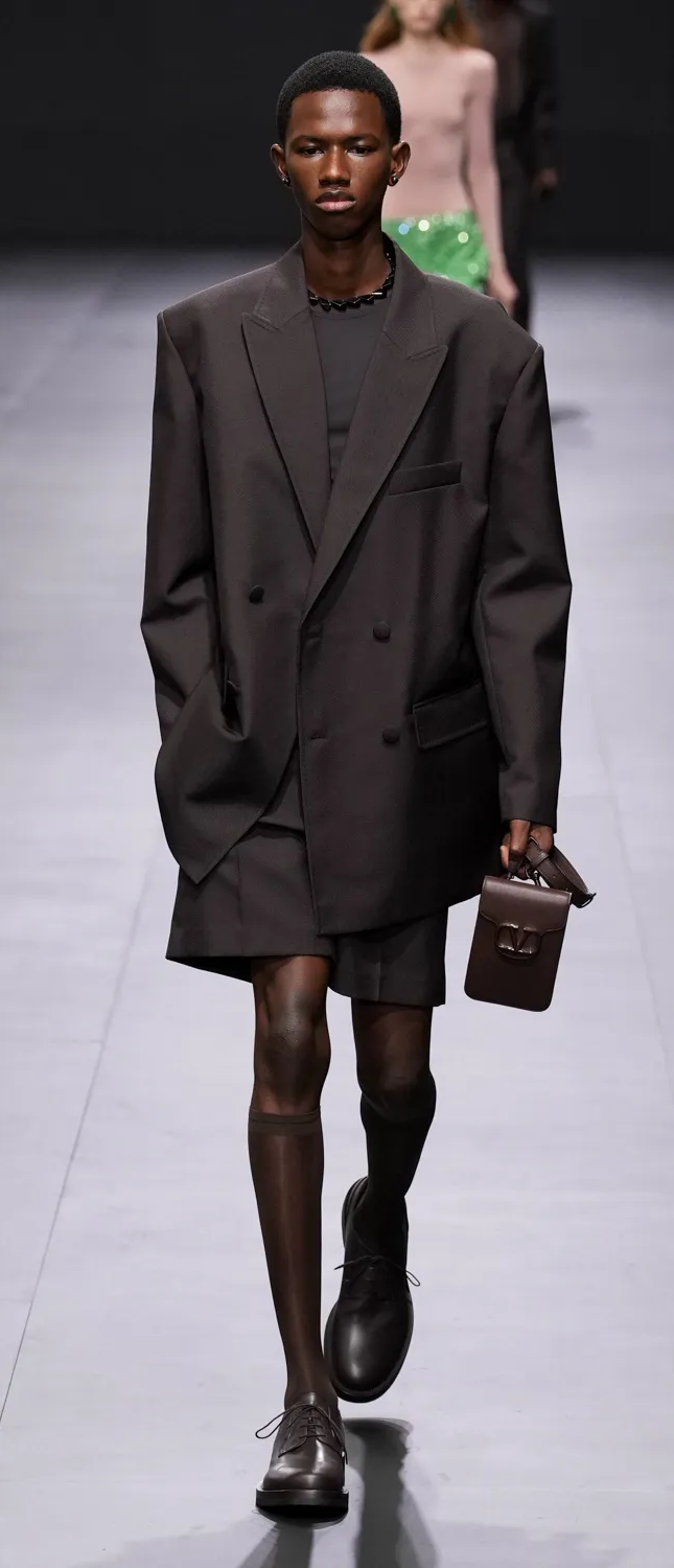 用高级定制时装中的精制面料来制作宽松惬意的百慕大西服和运动套装是Valentino的日常表达。利落简约的廓形搭配富有光泽感的面料,质感十足。